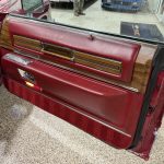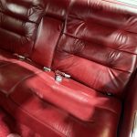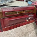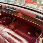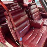 Dark Crimson leather covers power-adjustable split front bench and rear bench, with woodgrain trim, automatic climate control, Twilight Sentinel headlights, power windows/locks, cruise control, and AM/FM eight-track stereo. Cabin is spacious and well-preserved; clock non-functional, prior seat motor/leather repairs done.
