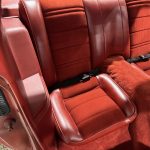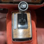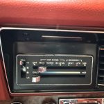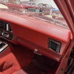 The interior is trimmed in matching Dark Firethorn cloth (code 7IN) on the front and rear bucket seats, coordinated with dashboard, door panels, carpeting, and woodgrain accents for a cohesive, upscale cabin feel. A center console adds sporty flair, while amenities include air conditioning for comfort and a modern aftermarket digital stereo with auxiliary inputs (original factory radio included). The two-spoke steering wheel is mounted to a tilting column, framing a straightforward layout with 100-mph speedometer and fuel gauge. A small crack appears on the upper-left dashpad — typical age-related patina for 1970s plastics — but the cabin otherwise presents very well for the mileage, with bright upholstery and relatively fresh materials consistent with just 19,000 documented miles.