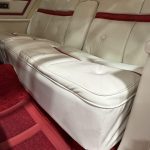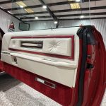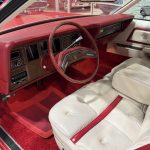 The luxurious interior features white leather upholstery with Lipstick Red accents on power-adjustable front seats, a full rear bench, deep-pile carpeting, automatic climate control, cruise control (integrated into the multifunction steering wheel), Quadrasonic AM/FM stereo, power windows and locks, and anti-fog glass. The dashboard includes a 120-mph speedometer and central fuel gauge; note the non-functional clock as a minor age-related item. The spacious cabin offers vast legroom, premium materials, and impressive preservation consistent with low mileage.