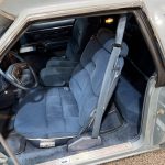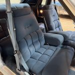 Blue velour trims power-adjustable driver’s seat and rear bench, with AM/FM stereo, power windows/locks, air conditioning, and tilt steering column framing an 180-km/h speedometer, tachometer, clock, and auxiliary gauges. Spacious cabin is well-preserved as a near time-capsule.