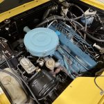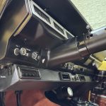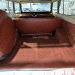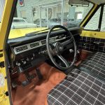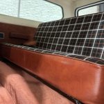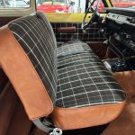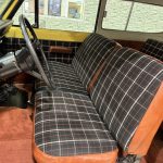 Russet plaid cloth with brown vinyl sides trims split-back front bench and rear bench, with push-button AM/FM radio, added sound insulation, replaced carpets, and overhauled A/C. VDO pyrometer under dash; three-spoke steering wheel frames 85-mph speedometer and auxiliary gauges.