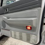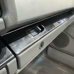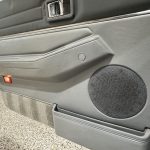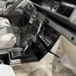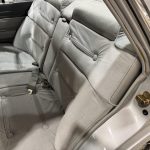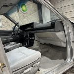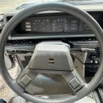The spacious and well-appointed interior seats five comfortably, featuring front bucket seats and a rear bench upholstered in gray cloth, with matching dashboard, headliner, and door panels. Factory luxury equipment includes air conditioning, cruise control, rear window defroster, power windows, power mirrors, power door locks, and a factory AM/FM/cassette stereo. The two-spoke steering wheel fronts straightforward analog instrumentation: an 85-mph speedometer flanked by coolant temperature and fuel gauges, with the ultra-low six-digit odometer confirming the car’s pampered history. The seller notes minor interior wear and discoloration on the seat upholstery and front-left door panel, plus a non-matching glovebox door color — honest details on an otherwise well-preserved example.