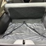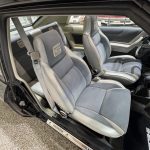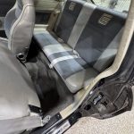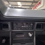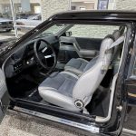 The interior features bolstered front bucket seats and a folding rear bench trimmed in gray vinyl with gray cloth inserts, accented by embroidered Carroll Shelby logos on the headrests and backrests for authentic Shelby branding. Appointments include air conditioning for comfort, crank windows (typical of lightweight performance models), Shelby-branded floor mats, and a factory cassette stereo. The four-spoke steering wheel frames an 85-mph speedometer (with added 125-mph decal), 7k-rpm tachometer, and gauges for fuel, coolant temperature, voltage, and oil pressure — all oriented toward the driver. A numbered plaque with Carroll Shelby signature graphic confirms its place as #223 in the limited run. The cabin shows honest age on some rear plastic trim but remains very well preserved overall for a 37k-mile example.